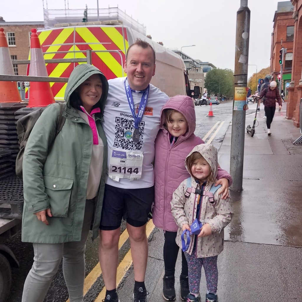 Eoin after finishing Dublin Marathon with his Family Helen, Saoirse and Aoibhín